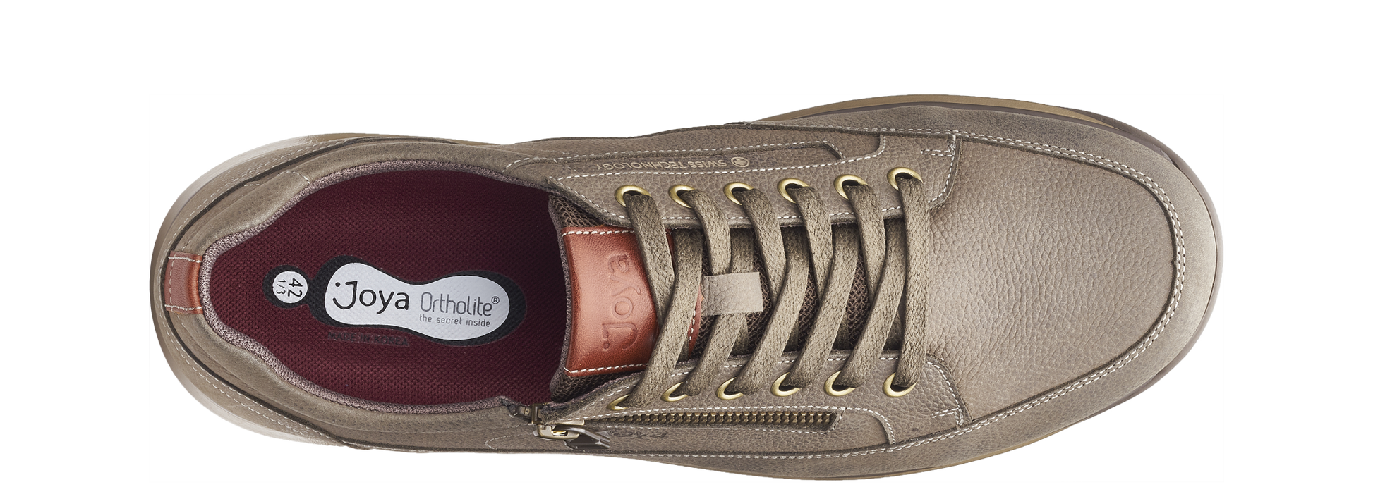Gewalkter Nubukleder Schnürschuh mit zusätzlichem Reißverschluss für einfachen Einstieg, mit atmungsaktivem Mesh-Futter. Ausgestattet mit der Joya Senso Sohlentechnologie, die für eine hervorragende Dämpfungswirkung und eine ausgewogene Druckverteilung sorgt und optimalen Komfort und Entlastung für die Rückenmuskulatur, Gelenke und Füße im Alltag bietet.
